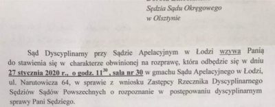 W Łodzi, 27 stycznia 2020 r. godz. 11.30 sala 30 Sądu Apelacyjnego, odbędzie się rozprawa dyscyplinarna sędzi Doroty Lutostańskiej z Olsztyna, która w listopadzie ubiegłego roku utrzymała w mocy uniewinnienie sprawców ubrania w koszulki „Konstytucja” bab pruskich. Zastępca rzecznika dyscyplinarnego zarzuca jej niewyłączenie się od orzekania, skoro w identycznej koszulce sfotografowała się przed sądem z okazji 100-lecia niepodległości. Pisałam o tej sprawie na naszym blogu 28 kwietnia 2019 r. http://www.sedziowie.nazwa.pl/nucleus/index.php?itemid=125#more