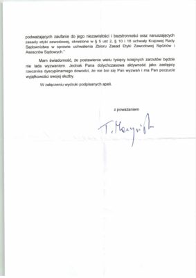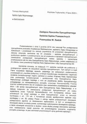 Sędzia Tomasz Marczyński z Sadu Rejonowego w Bełchatowie  wysłał list do Zastępcy Rzecznika Dyscyplinarnego Sędziów Sądów Powszechnych, sędziego Przemysława Radzika w związku z postępowaniem przeciwko sędziemu SO w Katowicach – Krystianowi Markiewiczowi: