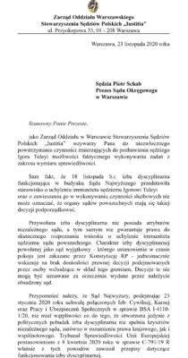 Prezesie Schab, sędzia Igor Tuleya jest nieprzerwanie uprawniony do wykonywana swoich zadań (pismo SSP Iustitia) 24/11/2020 Redakcja 5 (1) Warszawski Oddział Stowarzyszenia Sędziów Polskich „Iustitia” pisze do Prezesa Sądu Okręgowego Piotra Schaba w sprawie sędziego Igora Tuleyi: czynności administracyjne odsuwające sędziego Tuleyę od orzekania powinny zostać bezzwłocznie uchylone! How useful was this post? Click on a star to rate it! Submit Rating Average rating 5 / 5. Vote count: 1 No votes so far! Be the first to rate this post. 0 0 głosy Ocena artykułu