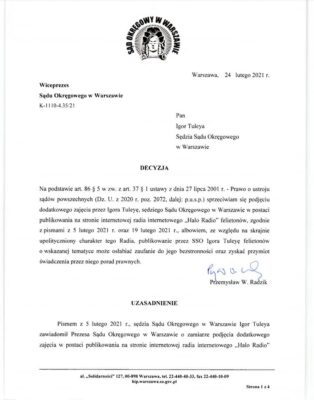Felietonu (podcastu) opublikowanego 19 lutego 2021 r., którego temat doskonale komponuje się z „Decyzją” P. Radzika, wysłuchoć można tutaj: Igor Tuleya 2021-02-19 12:50-12:55 – Halo.Radio