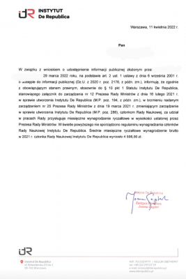 Od Redakcji: Publikujemy oficjalną informację Instytutu De Republica o miesięcznym wynagrodzeniu brutto członków rady naukowej: