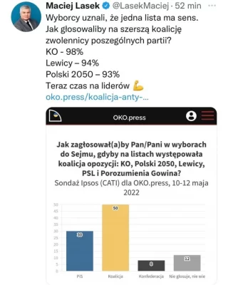 W każdej symulacji wyników, w przypadku jednej listy każde z tych ugrupowań wprowadzi więcej parlamentarzystów do Sejmu niż w przypadku 2, 3 czy 4 list. Ich argumenty o obawach swojego partyjnego zaplecza, że być może „stracą” mandaty, są pozbawione sensu. Aby stworzyć większość w przyszłym parlamencie i tak będą musieli stworzyć „szeroką koalicję”, bo Zjednoczona Prawica prawdopodobnie osiągnie swoje +/- 30% i by odsunąć ich od władzy, taka jest arytmetyka parlamentarna, będą współrządzić z tymi, z którymi dziś obawiają się budowania wspólnej listy, bo mają, jak powtarzają, „różne programy”. Czy oni udają idiotów czy nimi są? Myślą, że ludzie tego nie rozumieją? Nie potrafią odróżnić Tuska od Hołowni, a Kosiniaka-Kamysza od Nowackiej czy Gduli i że nie są w stanie wyobrazić sobie ich w jednej koalicji? Mówią, że ich wyborcy nie chcą lub obawiają się jednej listy. Nonsens. Przeprowadzane sondaże wskazują coś odwrotnego, a dokładne symulacje potwierdzają takie właśnie oczekiwania i wyniki, ba, wskazują, że nawet gdyby część potencjalnych wyborców poszczególnych partii nie poszła do wyborów z powodu jednej listy to „premia za jedność” wynikająca z zasad ordynacji byłaby większa niż ewentualna strata, choć i tak bardziej prawdopodobne jest, że akurat „premia za jedność” również skłoniłaby do zagłosowania tych, którzy zwykle na wybory nie chodzą. Jakby nie patrzeć wyszłoby „na plus”. Więc w czym tkwi problem?
