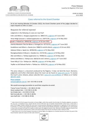 Wielka Izba Europejskiego Trybunału Praw Człowieka odrzuciła 10 października odwołanie polskiego rządu od wyroku z 16 czerwca 2022