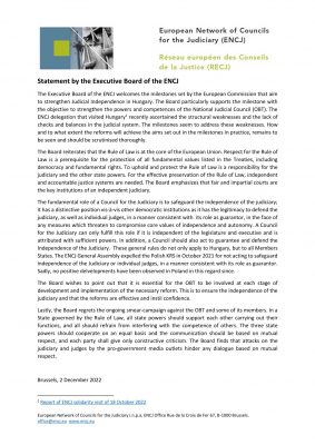 Rada Wykonawcza Europejskiej Sieci Rad Sądownictwa ENCJ z zadowoleniem przyjmuje kamienie milowe wyznaczone przez Komisję Europejską, które mają na celu wzmocnienie niezależności sądów na Węgrzech. Rada w szczególności popiera ten kamień milowy, którego celem jest wzmocnienie uprawnień i kompetencji Krajowej Rady Sądownictwa [OBT]. Delegacja ENCJ, która niedawno odwiedziła Węgry, stwierdziła słabości strukturalne oraz brak kontroli i równowagi w systemie sądownictwa. Wydaje się, że kamienie milowe mają na celu usunięcie tych słabości. Dopiero się okaże, jak i w jakim stopniu reformy pozwolą osiągnąć w praktyce cele określone w kamieniach milowych. Konieczna będzie dokładna analiza w tym zakresie. – pisze ENCJ w swoim Oświadczeniu opublikowanym 2 grudnia 2022 r.