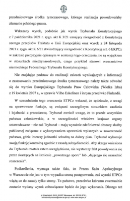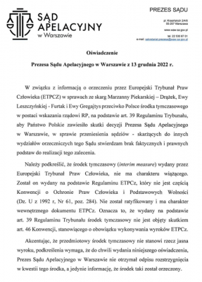 Akcentując, że przedmiotowy środek tymczasowy nie stanowi rzecz jasna wyroku, podkreślenia wymaga, że do chwili wydania niniejszego oświadczenia, Prezes Sądu Apelacyjnego w Warszawie nie otrzymał odpisu rozstrzygnięcia w kwestii tego środka, a jedynie informację, że środek taki został orzeczony.