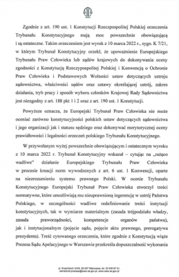 Zgodnie z art. 190 ust. 1 Konstytucji Rzeczpospolitej Polskiej orzeczenia Trybunału Konstytucyjnego mają moc powszechnie obowiązującą i są ostateczne. Takim orzeczeniem jest wyrok z 10 marca 2022 r., sygn. K 7/21, w którym Trybunał Konstytucyjny orzekł, że upoważnienie Europejskiego Trybunału Praw Człowieka lub sądów krajowych do dokonywania oceny zgodności z Konstytucją Rzeczypospolitej Polskiej i Konwencją o Ochronie Praw Człowieka i Podstawowych Wolności ustaw dotyczących ustroju sądownictwa, właściwości sądów oraz ustawy określającej ustrój, zakres działania, tryb pracy i sposób wyboru członków Krajowej Rady Sądownictwa jest niezgodny z art. 188 pkt 1 i 2 oraz z art. 190 ust. 1 Konstytucji. […]