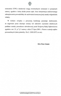 Prezes Sądu Apelacyjnego w Warszawie nie jest w tym wypadku stroną postępowania, zaś wyroki ETPCz wiążą co do zasady tylko strony. To państwo, przeciwko któremu ewentualnie zostanie wydany wyrok zobowiązane będzie do jego wykonania. Dlatego też orzeczenia ETPCz skutkować mogą ewentualnymi zmianami w przepisach ustawy, zgodnie z którą działa prezes sądu. Inna interpretacja analizowanego zabezpieczenia prowadziłaby do zachwiania konstytucyjnej zasady trójpodziału władzy.[…]