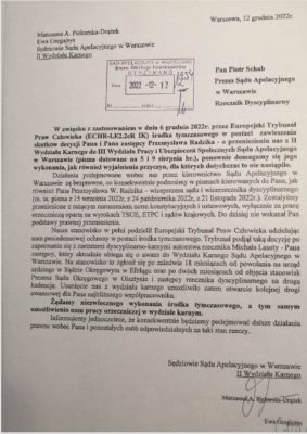 6 grudnia 2022 r. Europejski Trybunał Praw Człowieka orzekł o zabezpieczeniu w sprawie ze skargi trzech sędzi Sądu Apelacyjnego w Warszawie w związku z Ich przeniesieniem z Wydziału Karnego do Wydziału Pracy i Ubezpieczeń Społecznych tego Sądu: