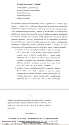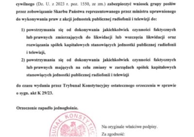 Ustosunkowując się do wezwania do usunięcia braku formalnego wniosku z 12 grudnia 2023 r. wskazuję, że brak udzielenia zabezpieczenia znacznie utrudni wykonanie wyroku Trybunału o niezgodności zakwestionowanych we wniosku przepisów ze wskazanymi wzorcami kontroli. Wszczęcie likwidacji będzie skutkowało ustanowieniem likwidatorów oraz dokonywaniem przez nich czynności likwidacyjnych wiążących się m.in. ze ściągnięciem wierzytelności, spłatą zobowiązań czy upłynnieniem majątku spółki. Pośrednim skutkiem likwidacji jest rozwiązanie umów o pracę z pracownikami spółki, w tym również tymi, którzy są objęci ogólną ochroną przed zwolnieniem. Tożsame argumenty dotyczą dokonywania zmian w zarządach spółek kapitałowych stanowiących jednostki publicznej radiofonii i telewizji.