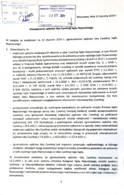 W związku ze zwołaniem na 12 stycznia 2024 r. zgromadzenia sędziów Izby Cywilnej Sądu Najwyższego: