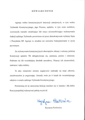 Na internetowej stronie Trybunału Konstytucyjnego ukazało się wzruszające oświadczenie sędzi Trybunału, prof. dr hab. Krystyny Pawłowicz, zapowiadające jej odejście ze służby z powodu uszczerbku na zdrowiu, spowodowanego przez akty nienawiści wobec niej samej, prezesa Trybunału i Trybunału jako konstytucyjnej instytucji.