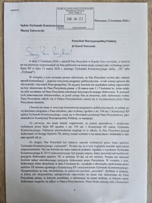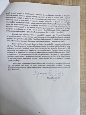 Ten list prof. Macieja Taborowskiego, sędziego Trybunału Konstytucyjnego, wywołany dziwnym wywiadem Karola Nawrockiego w Kanale „Zero”,  nie jest prośbą o  wysłuchanie skrzywdzonego człowieka, nie ma w nim wyrzutów ni próśb. To czytelny, precyzyjny i zrozumiały wykład o tym, co należy do obowiązków konstytucyjnych głowy państwa, a co Karol Nawrocki próbuje – świadomie lub nie, co jest bez znaczenia – sobie uzurpować. Pomoże też Czytelnikom, którzy nie muszą przecież znać się na prawie konstytucyjnym, wyrobić sobie własną opinię o charakterze postawy prezydenta.