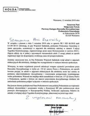 Stowarzyszenie im. Prof. Zbigniewa Hołdy otrzymało pismo od Rzecznika Dyscyplinarnego Prokuratora Generalnego. Pani rzecznik Małgorzata Nowak w związku ze „wstępnym ustalaniem znamion przewinienia dyscyplinarnego” pytała o przeprowadzone przez prokuratora w stanie spoczynku Wojciecha Sadrakuły zajęcia w ramach Tygodnia Konstytucyjnego.